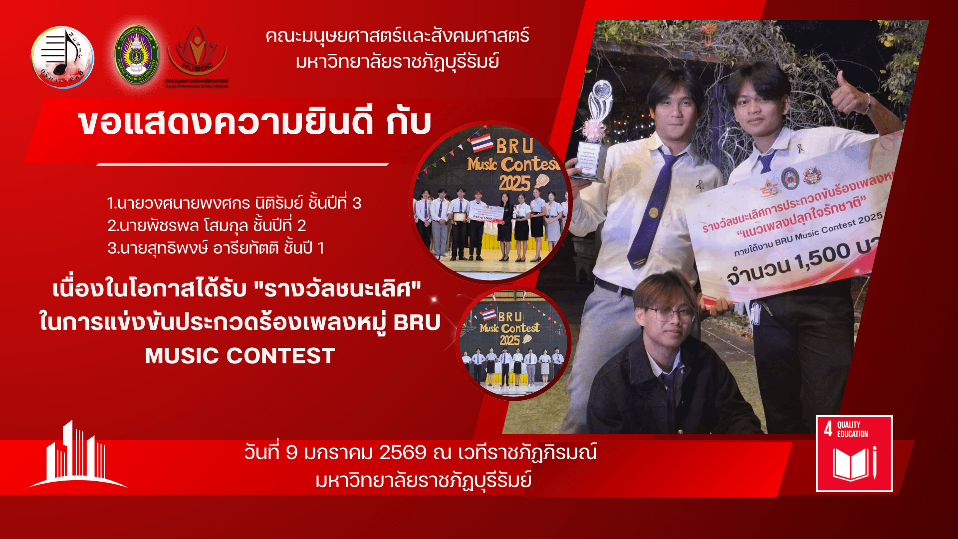 สาขาวิชาดุริยางคศิลป์ คณะมนุษยศาสตร์และสังคมศาสตร์ ขอแสดงความยินดีกับตัวแทนนักศึกษาที่สร้างชื่อเสียงให้กับสาขาวิชาและคณะฯ ในการแข่งขันประกวดร้องเพลงหมู่ BRU MUSIC CONTEST ซึ่งจัดขึ้นเมื่อวันที่ 9 มกราคม 2569เวทีราชภัฏภิรมณ์ มหาวิทยาลัยราชภัฏบุรีรัมย์